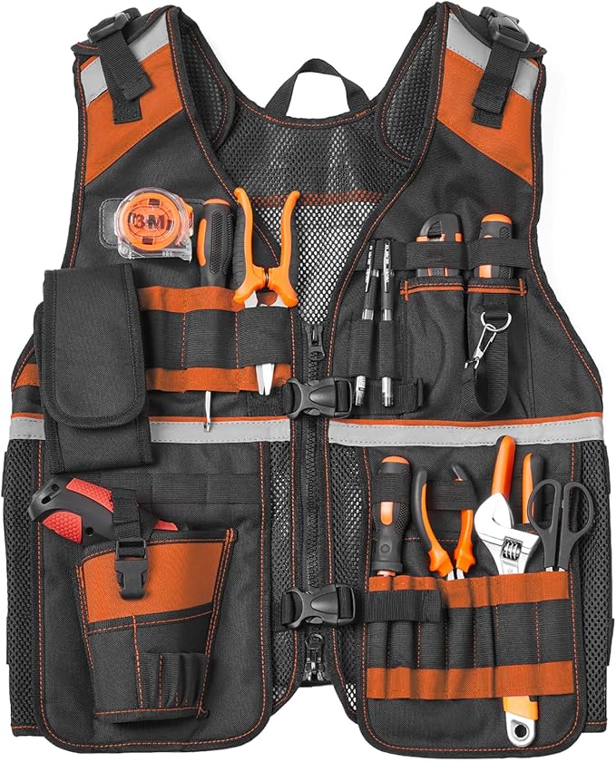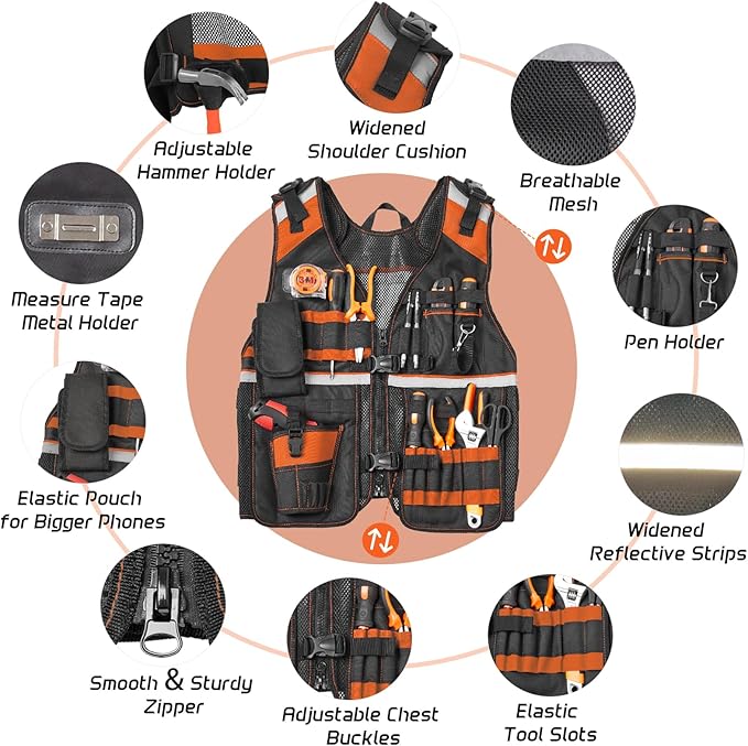 Electrician Tool Vest for Men, Reflective Safety Work Vest with Adjustable Thick Straps, Removable Phone Holder for Electrical, Carpenters, Construction, 22 Pockets